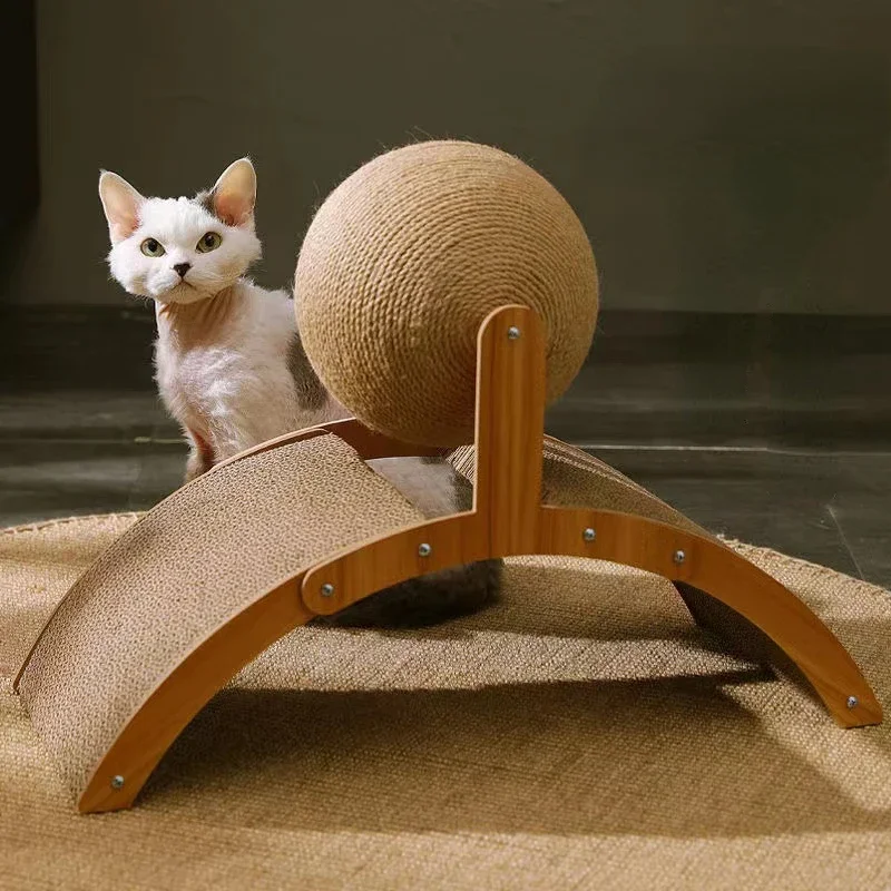 A stylish wooden scratcher that combines a rotating sisal ball and a curved scratching ramp, giving your cat multiple ways to stretch, claw, and climb while protecting your furniture.